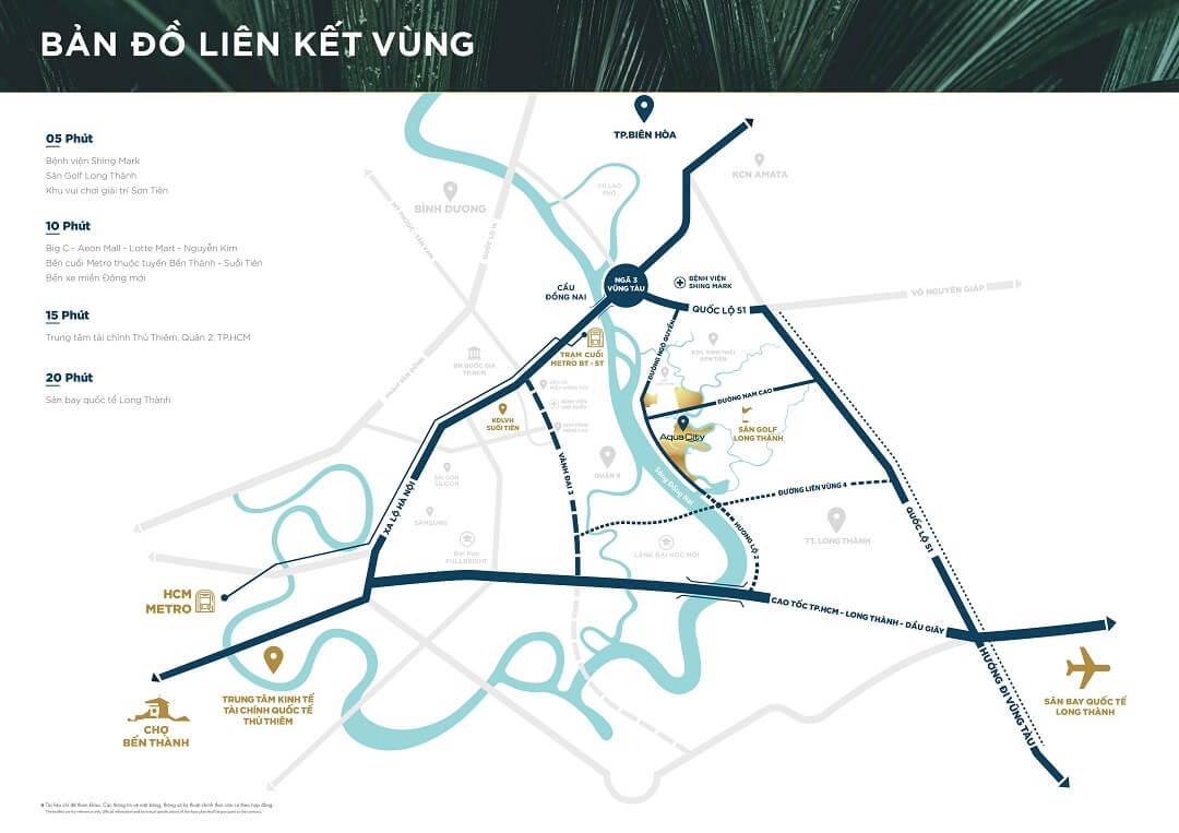 Khu đô thị sinh thái Aqua City 3 mặt giáp sông, nằm ở xã Long Hưng (Biên Hòa) cạnh sân Golf Long Thành, sở hữu vị trí tam giác TPHCM – Đồng Nai – Vũng Tàu và các tỉnh miền tây. Nằm ngay trên trục đường lớn Hương Lộ 2 (Ngô Quyền nối dài) kết nối lên cao tốc Long Thành Dầu Giây, cư dân chỉ mất 15 phút vào Quận 2. Liền kề sân Golf Long Thành.