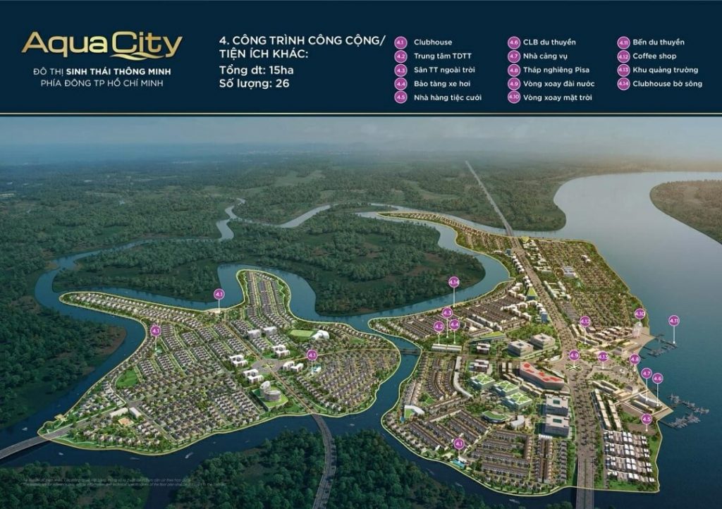 Aqua City Biên Hòa là khu đô thị sinh thái mang lại không gian sống xanh ven sông Đồng Nai. Hệ thống tiện ích nghỉ dưỡng tại đây như, khu thương mại, Club house, hồ bơi. Đặc biệt bến du thuyền tại sông Đồng Nai, cư dân Aqua City có thể trải nghiệm cuộc sống đẳng cấp tại đây. Hệ thống trường mẫu giáo, trường cấp hai tại đây cũng được chú trọng. Khu vui chơi trẻ em, công viên cây xanh…
