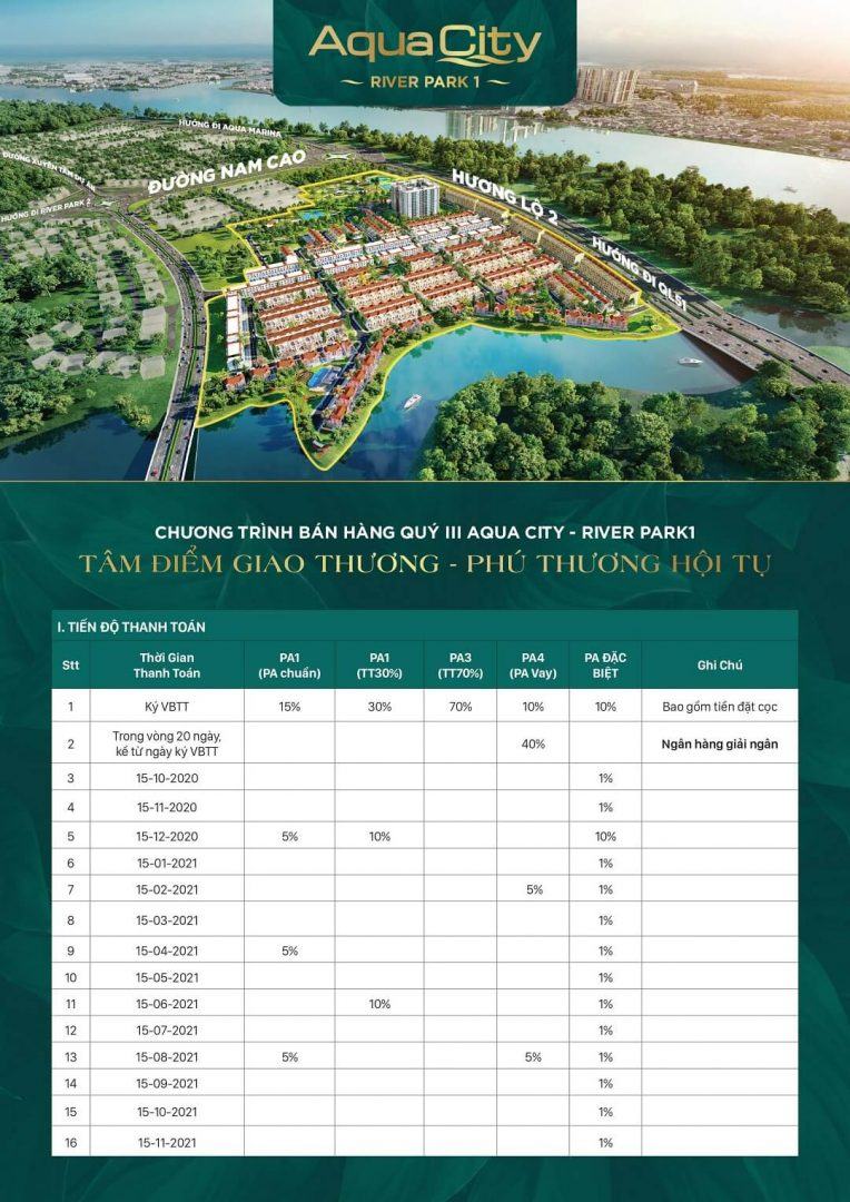 Aqua City River Park là phân khu mới ra mắt trong tháng 9 này, vị trí đắc địa với 3 mặt sông. Vị trí đắc địa 2 mặt tiền đường 33m v?60m, đối diện khu thương mại ven sông Đông Nai, bao quanh công viên ven sông, thiết kế thông thoáng hiện đại. Quý khách hàng vui lòng “ click” vào hình để xem chi tiết mặt bằng và thiết kế từng loại diện tích